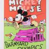 A serigraph poster reproduction for the Disney Studios Mickey Mouse animated short "Barnyard Olympics," originally released in 1932 and distributed by Columbia Pictures. Featuring a fantastic image of Mickey leaping over a chicken coop, the poster was reprinted in the 1990s by Circle Fine Art. Measuring 30.5"x20.75” overall, the poster is in very good condition with minor discoloration and light edge and corner wear.
